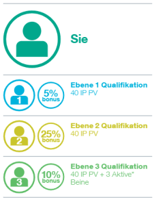 Da du mit den Produkten zufrieden bist und diese weiterempfiehlst, hast du das Ausgangskriterium (40 IP) für Bonuszahlungen erfüllt. Das nennt sich dein Persönliches Volumen (PV) und du bist automatisch für 2 Arten von Empfehlungsboni qualifiziert.